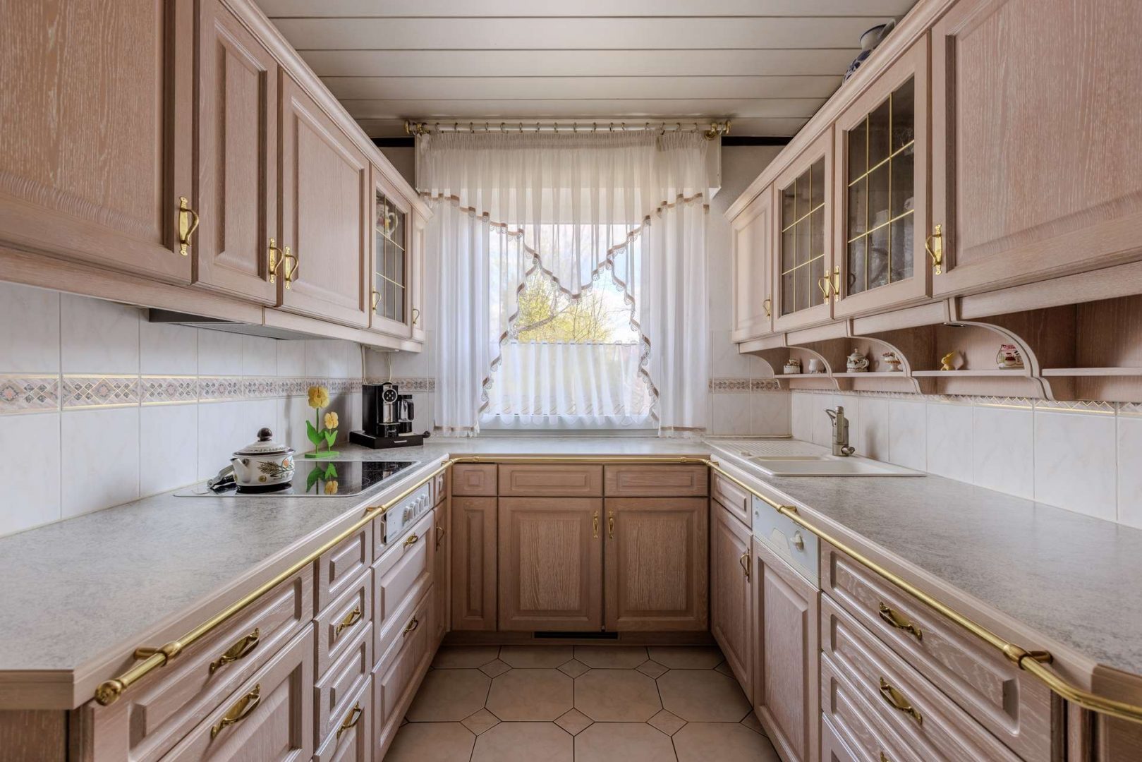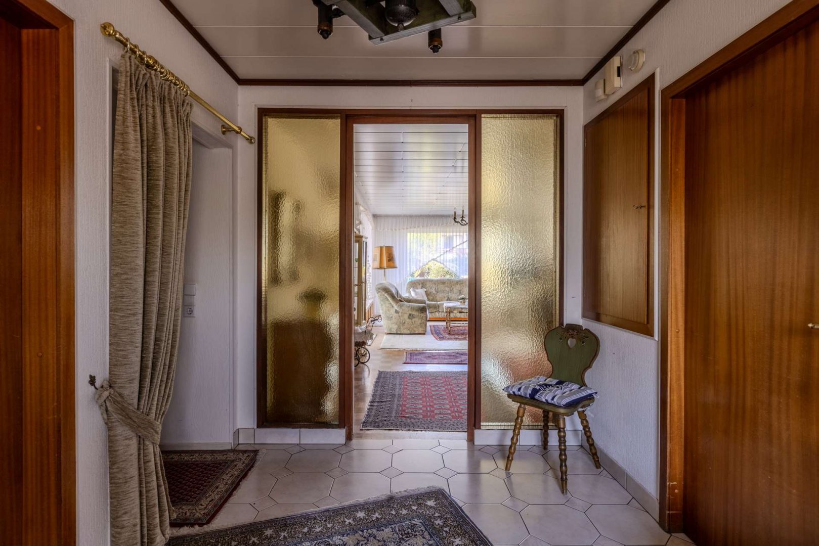 Schon beim Betreten des Hauses empfängt Sie ein zentraler Flur, der den Blick auf die Raumtiefe lenkt und eine klare Orientierung im Haus ermöglicht. Direkt rechts vom Eingang befindet sich die Küche, klassisch und geschmackvoll gestaltet. Sie ist funktional geschnitten und vom Flur aus leicht zugänglich – ideal für den Alltag und die Zubereitung gemeinsamer Mahlzeiten. Links vom Eingang liegt das Gäste-WC, praktisch für Besucher und daneben führt eine Tür direkt in den Keller, der weit mehr als nur Stauraum bietet.