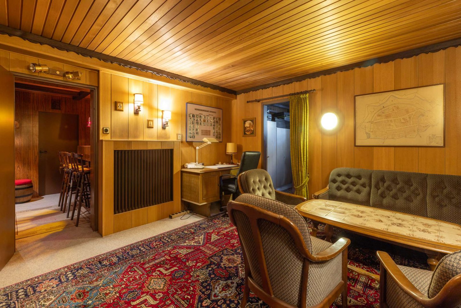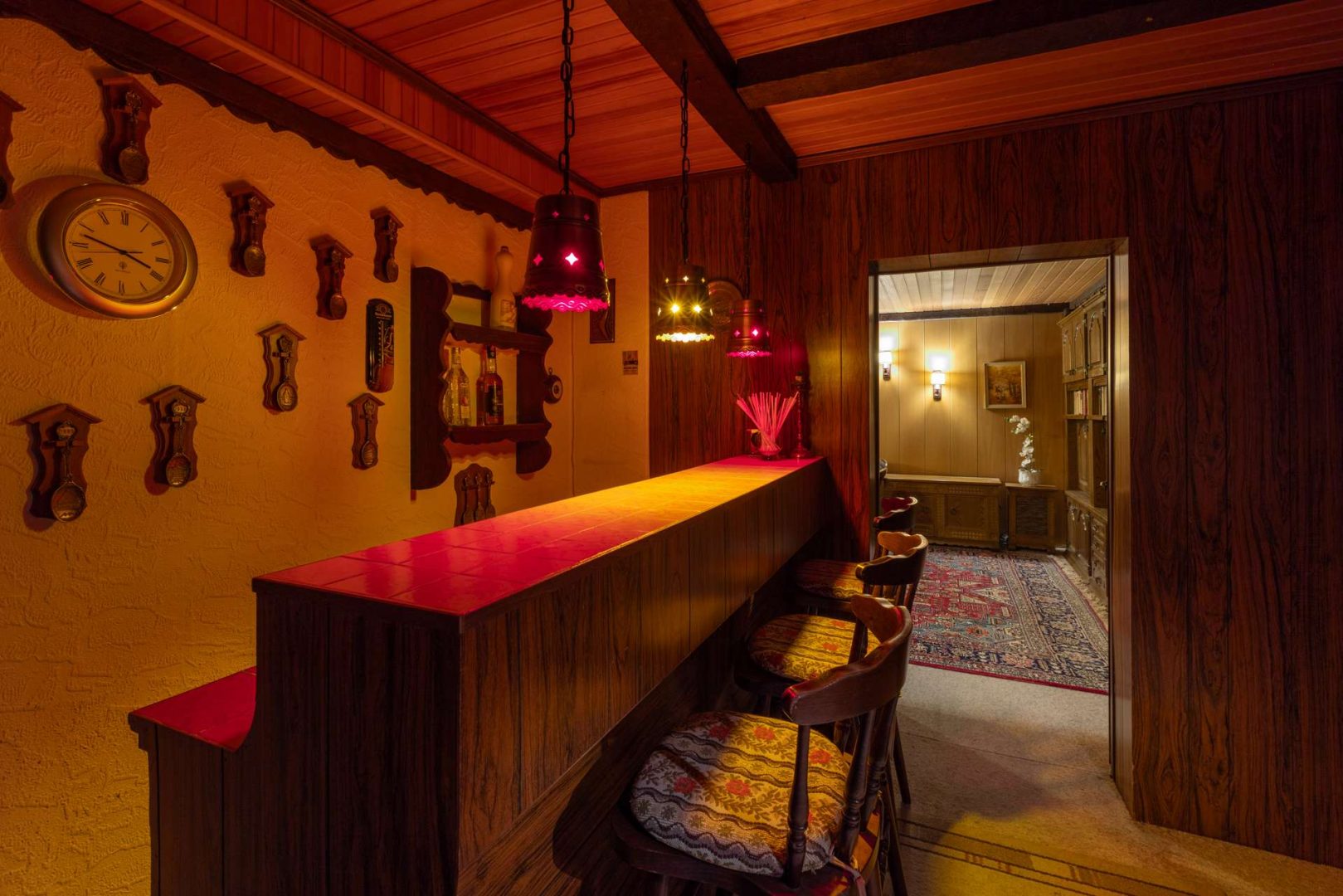 Ein besonderes Highlight des Hauses ist der Keller, der weit mehr bietet als reine Abstellflächen: Eine Bar sorgt für gesellige Abende mit Familie und Freunden, ein großzügiges Arbeitszimmer im klassischen Stil bietet zusätzlichen Platz für Kreativität oder konzentriertes Arbeiten. Zudem gibt es eine Dusche für schnelle Erfrischungen und eine separate Sauna, die zu entspannten Wellnessmomenten direkt zu Hause einlädt. Zwei weitere Räume werden derzeit als Abstellflächen genutzt, können aber flexibel für Hobbys, Lagerung oder individuelle Projekte verwendet werden.